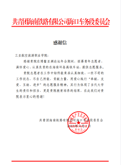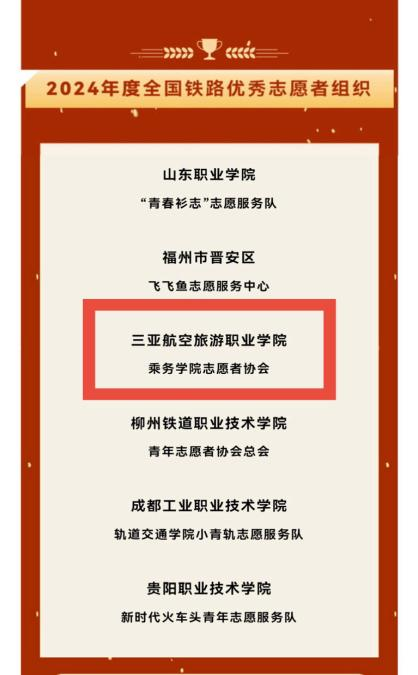 近日,三亚航空旅游职业学院乘务学院志愿者协会荣获“全国铁路优秀志愿者组织”称号!这是对学校志愿工作的充分肯定,更是属于每一位志愿者的荣光!