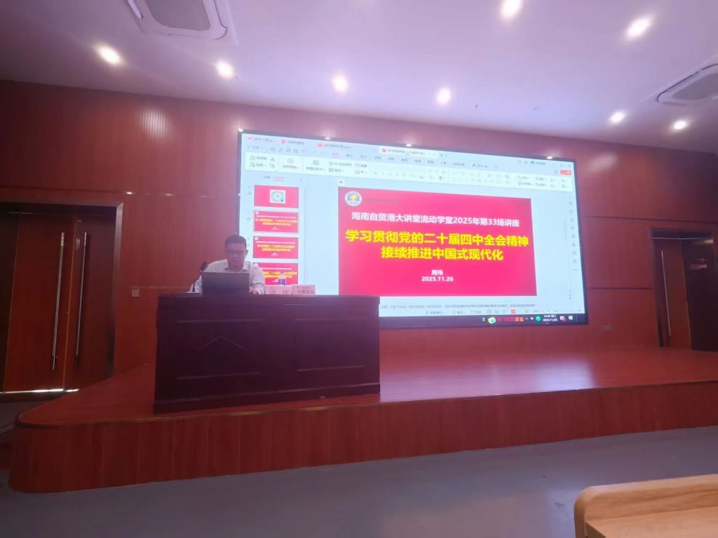 11月26日,由海南省社科联(省社科院)主办的海南自由贸易港大讲坛流动学堂2025年第33场报告会在三亚航空旅游职业学院举行。海南热带海洋学院马克思主义学院院长、教授周伟以《学习贯彻党的二十届四中全会精神接续推进中国式现代化》为题作报告。三亚航空旅游职业学院近150名师生代表参加学习。